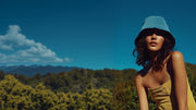 Woman wearing a blue bucket hat and yellow top in a forest with mountains in the background